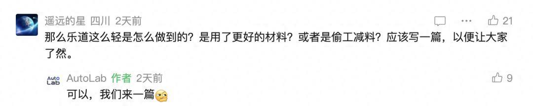 于是就有读者好奇:“乐道这么轻是怎么做到的?是用了更好的材料?或者是偷工减料?”