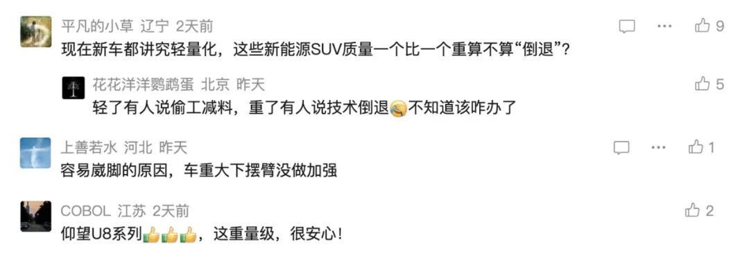 结论简单来说就是:最重、采用非承载车身的仰望U8,重量快赶上中巴了;而最轻的乐道L90,居然才两吨出头。