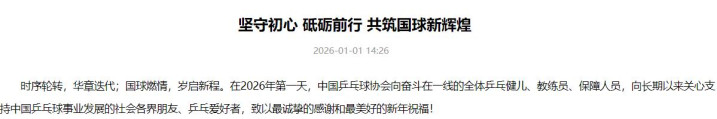 2025年已经结束,就在2026年到来的第一天,中国乒乓球协会公开发长文对过去一年的工作以及国乒的表现进行总结,同时对新的一年进行展望,表达了“坚守初心,砥砺前行,共筑国球新辉煌”的意愿鹰眼策略,同时透露“新周期国家队教练员团队的竞聘工作已按程序稳步推进,现场陈述与评审环节已顺利完成”,结果即将公示,值得大家关注!